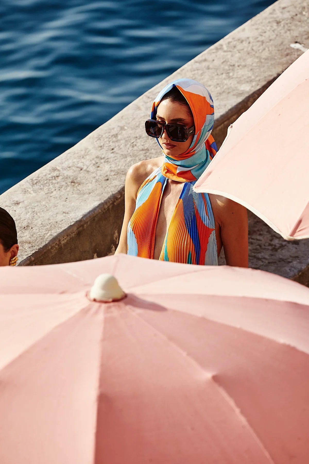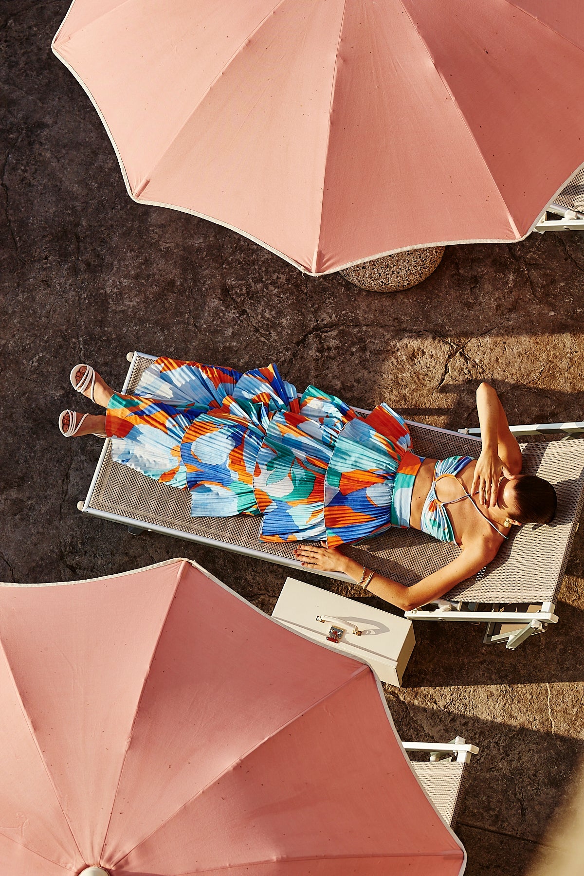 Alongside the crew – arriving from Australia, New York, Spain, London, and Copenhagen (to name a few) – we launched straight into the campaign shoot, spanning four days. Together, we worked to capture the essence of a luxurious, languorous European escapade (a summer soiree spent mooching around a medieval castle, drenched in sunshine, and quenched by spritzes!) The end result? Think models posing poolside, draped in L’IDEE’s lavish signature pleats and vibrant colours. For the hair, our team delivered a modern take on shapes and styles reminiscent of the golden age of Italian cinema.