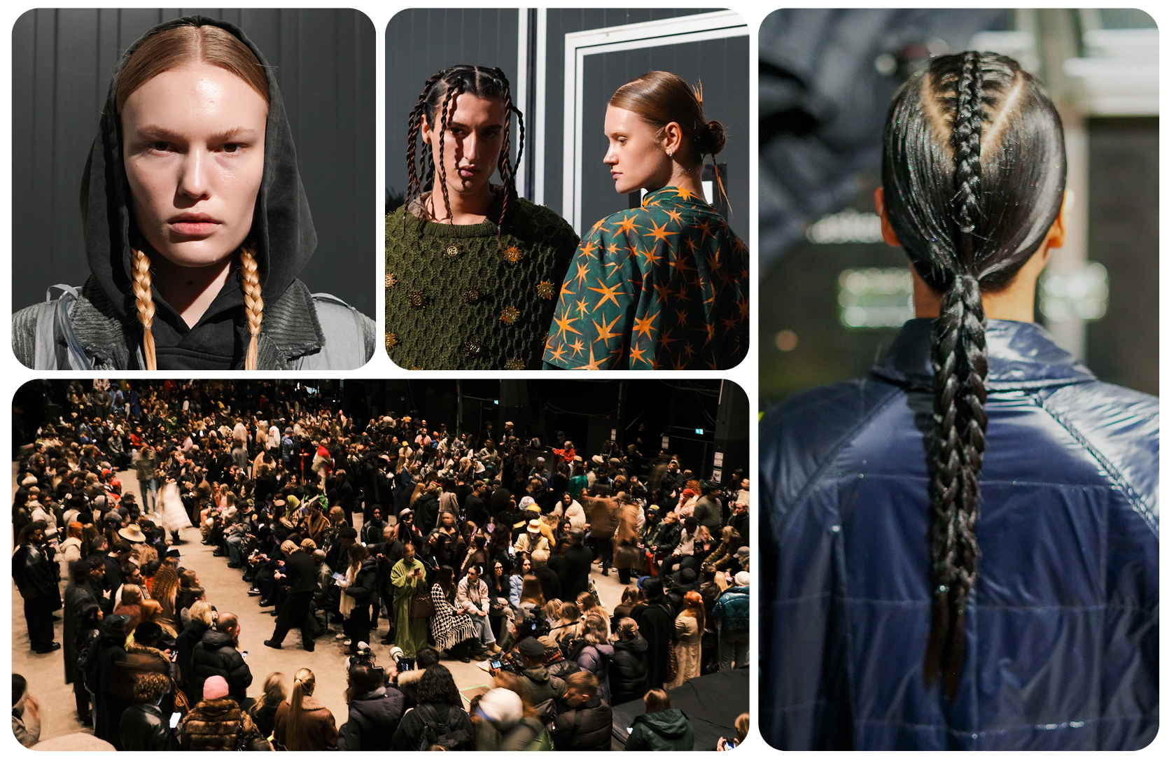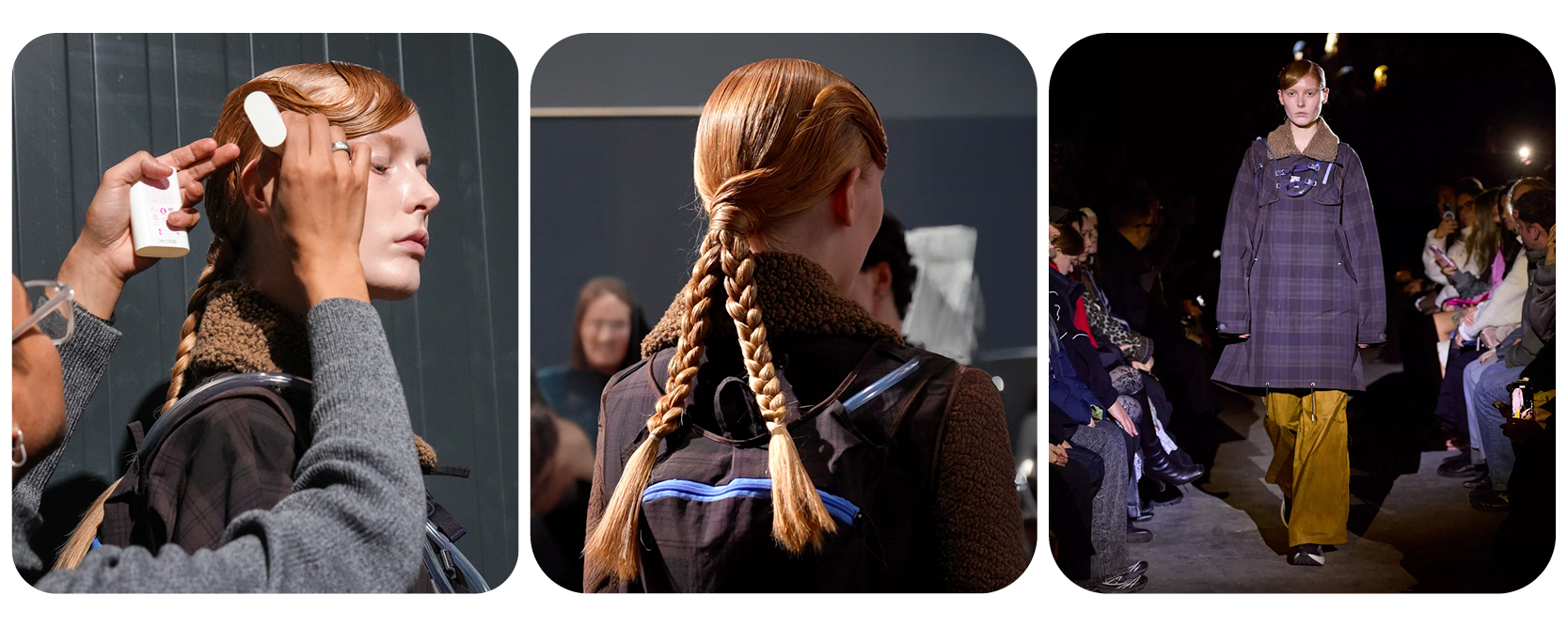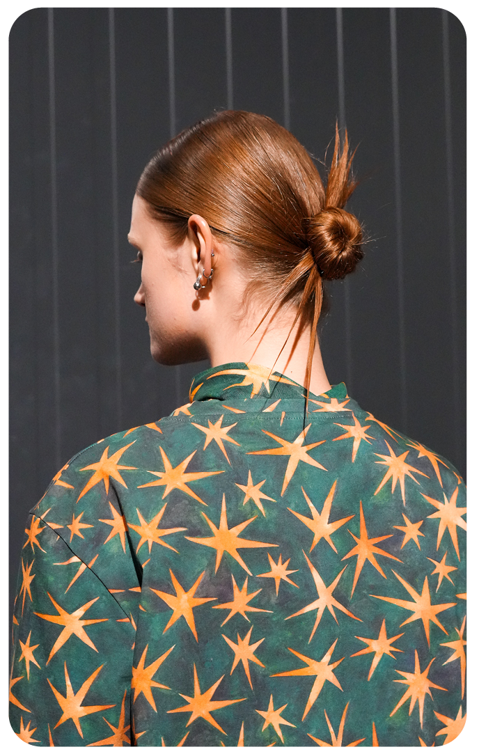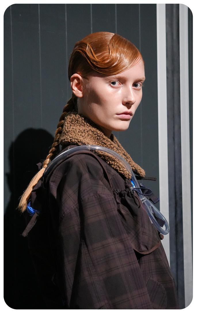 Various techniques were applied to mirror Rolf Ekroth’s craftsmanship and overarching theme. Braiding and twisting methods were used away from and flat to the scalp, forming plaited ponytails that were intricate, detailed, and practical—a reflection of the bead weaving and handcrafted elements present in the collection. The hair was also parted in a Zigzag and ‘E’ design, a nod to Ekroth’s signature cuts and patterns. A swept fringe symbolized the wet and windy conditions of Nordic winters, while a bun with a fanned effect paid tribute to the sun worshippers depicted in the show.