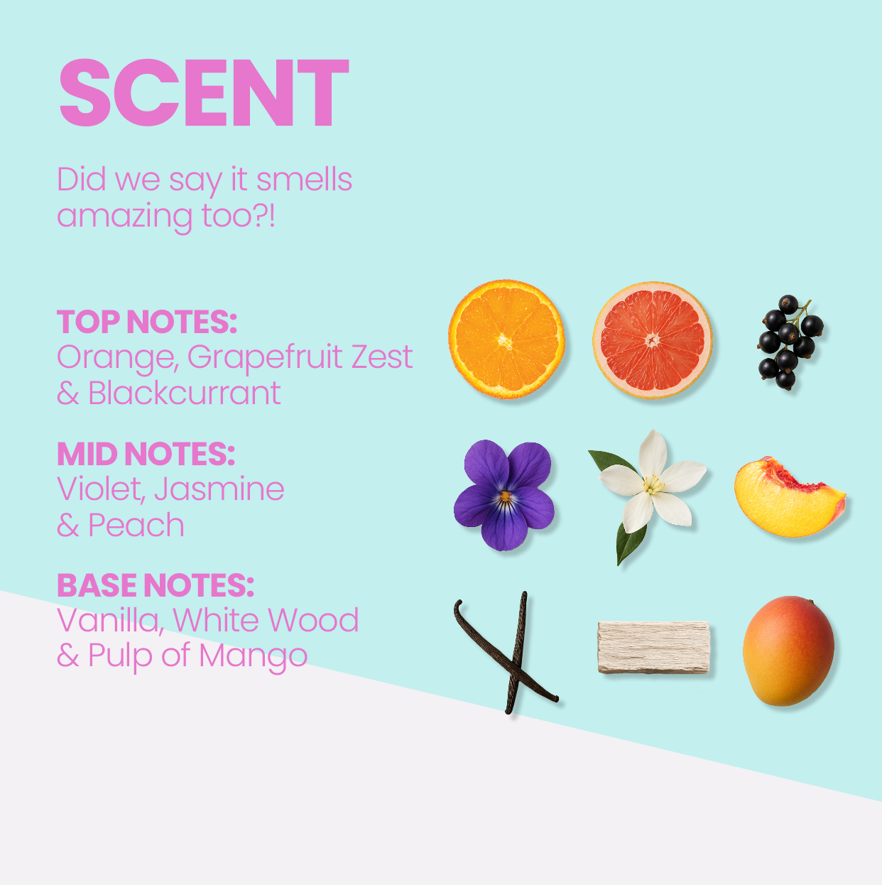 The formula is gluten free, lightweight, and infused with a fresh fragrance featuring top notes of orange, grapefruit zest and blackcurrant, mid notes of violet, jasmine and peach, and base notes of vanilla, white wood, and pulp of mango. Heat styling just began to smell as good as it looks